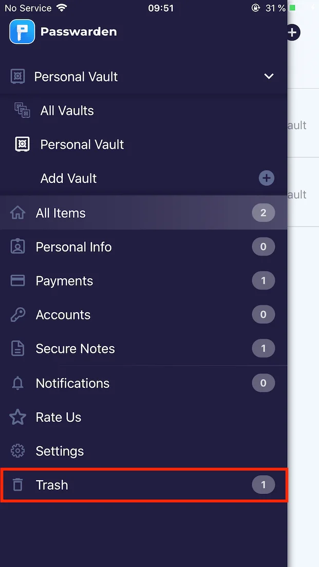 1. Trash(ゴミ箱)タブを開き、復元したいVaultを選択します。