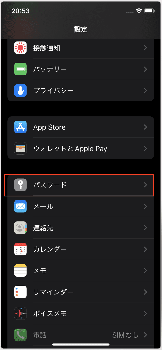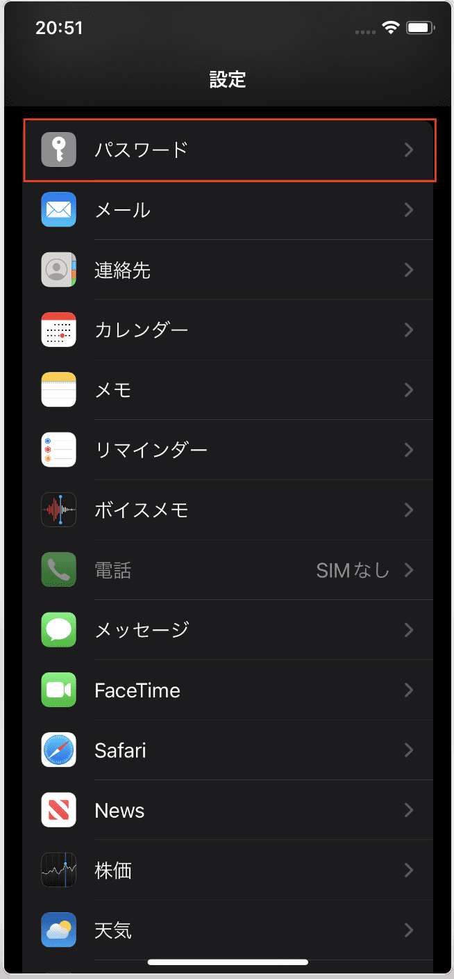 Passwords & Accounts(パスワードとアカウント)またはPasswords(パスワード)タブを開きます。iOSのバージョンによって名称が異なる場合があります。