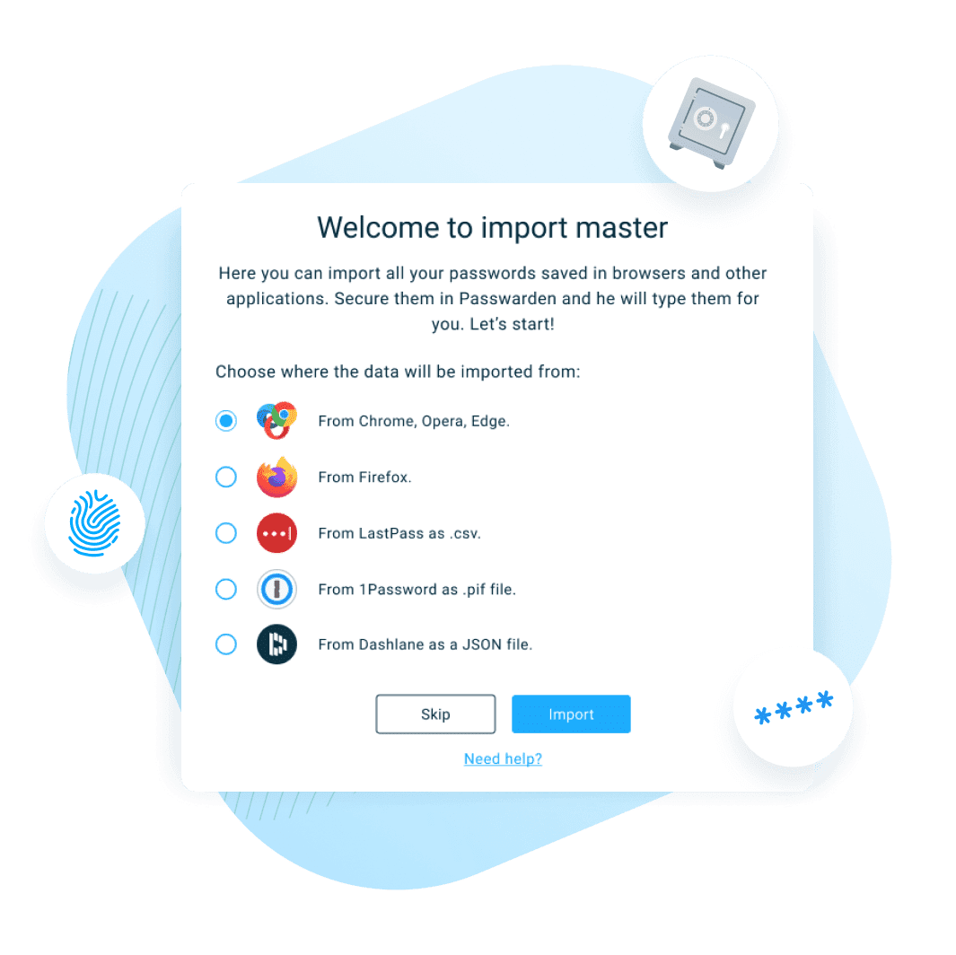 データ移行機能を使って、パスワード、アカウント情報、その他の貴重な情報をPasswardenストレージにインポートして、安全に過ごしましょう。