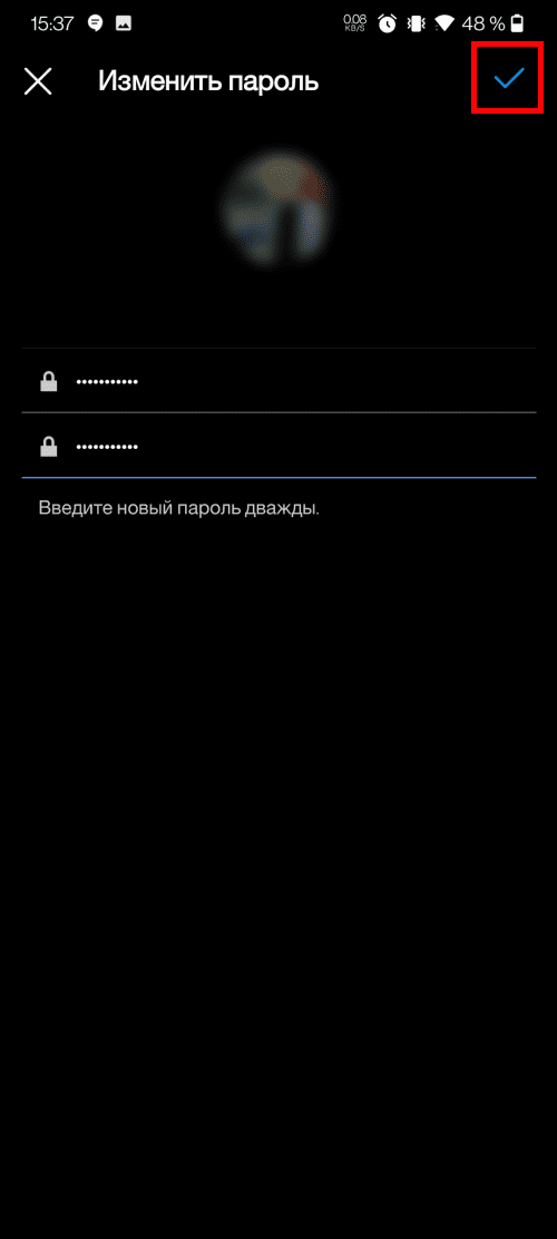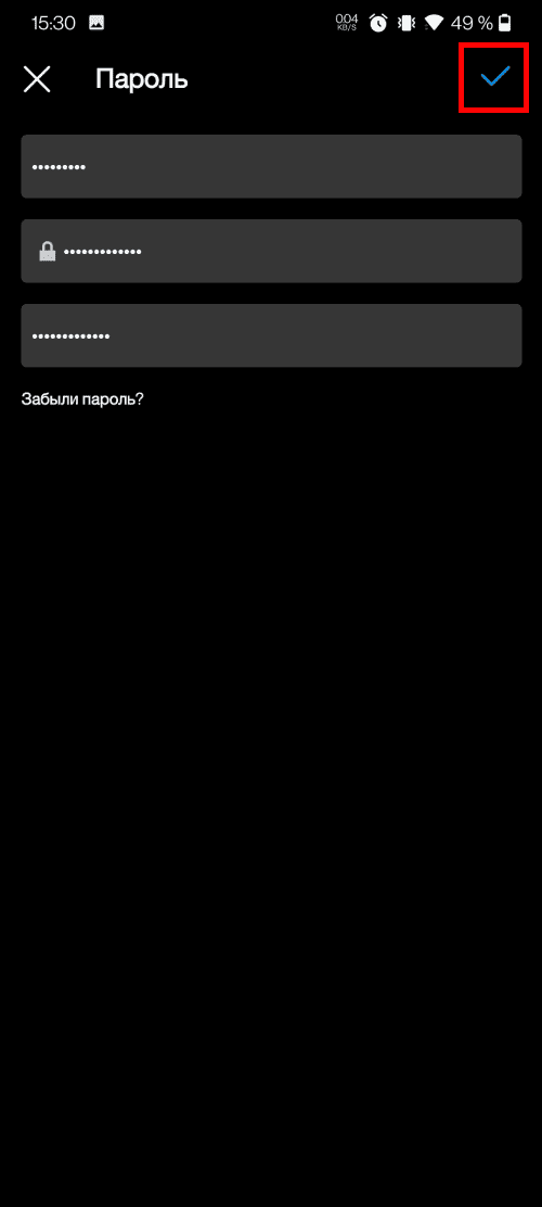 7. Чтобы завершить смену пароля, нажмите значок подтверждения в верхнем правом углу экрана.