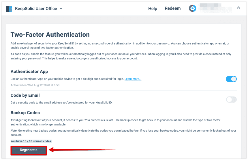 8. Если вы использовали или потеряли все резервные коды, нажмите кнопку Восстановить (Regenerate).