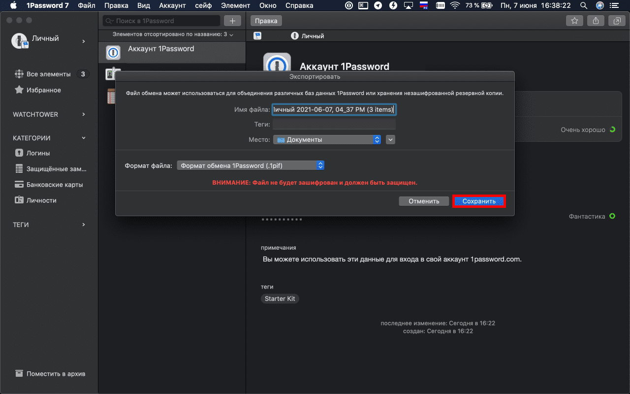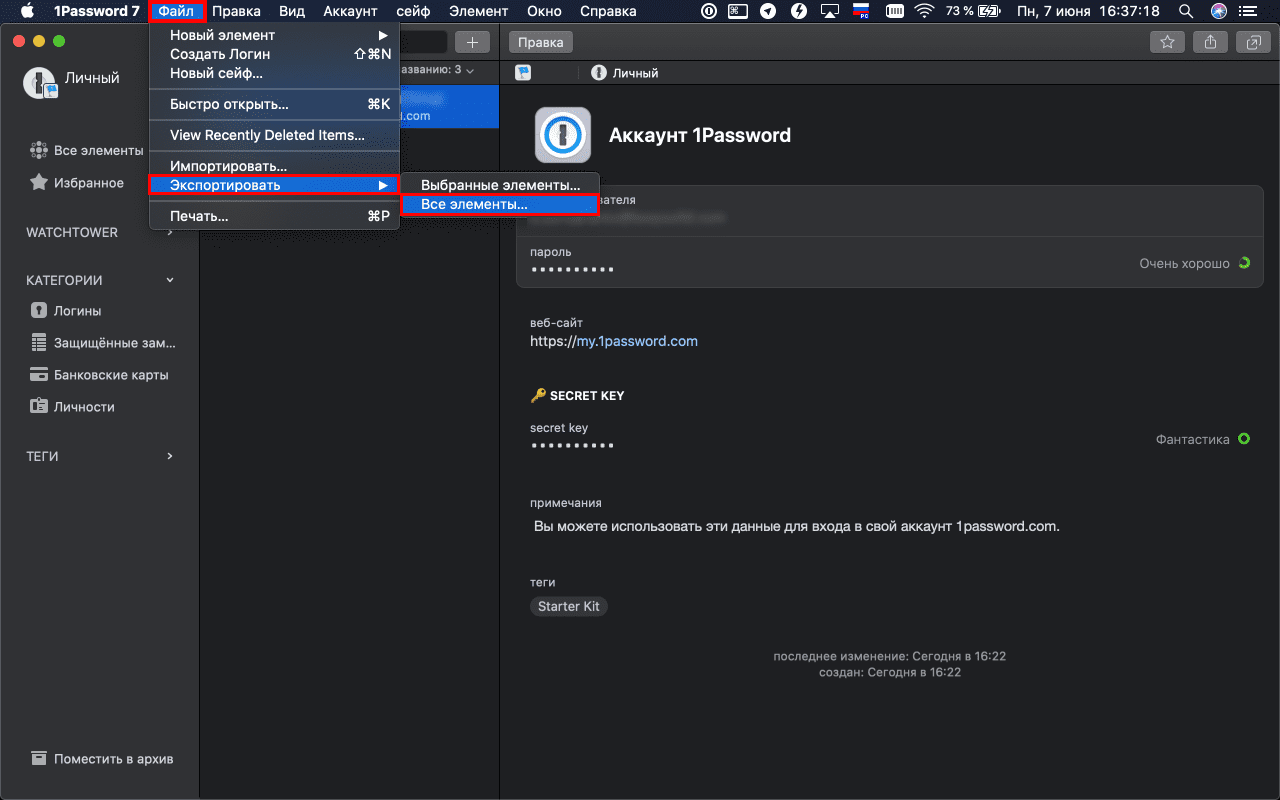1. Откройте приложение 1Password на своем устройстве с macOS или Windows и перейдите во вкладку Все элементы. Нажмите Файл > Экспортировать... > Все элементы.