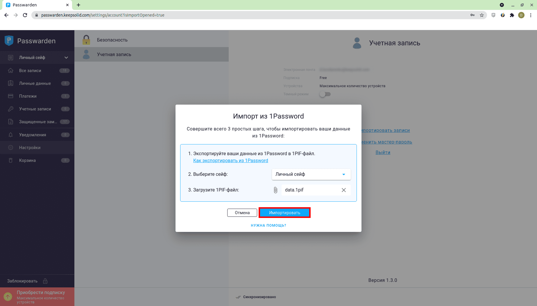 3. Выберите Сейф, в который хотите импортировать ваши данные и загрузите экспортированный файл. Нажмите Импортировать.