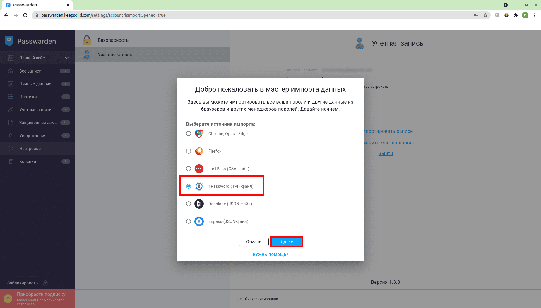 1. Откройте наш безопасный менеджер паролей и перейдите в раздел Настройки > Учетная запись > Импортировать.