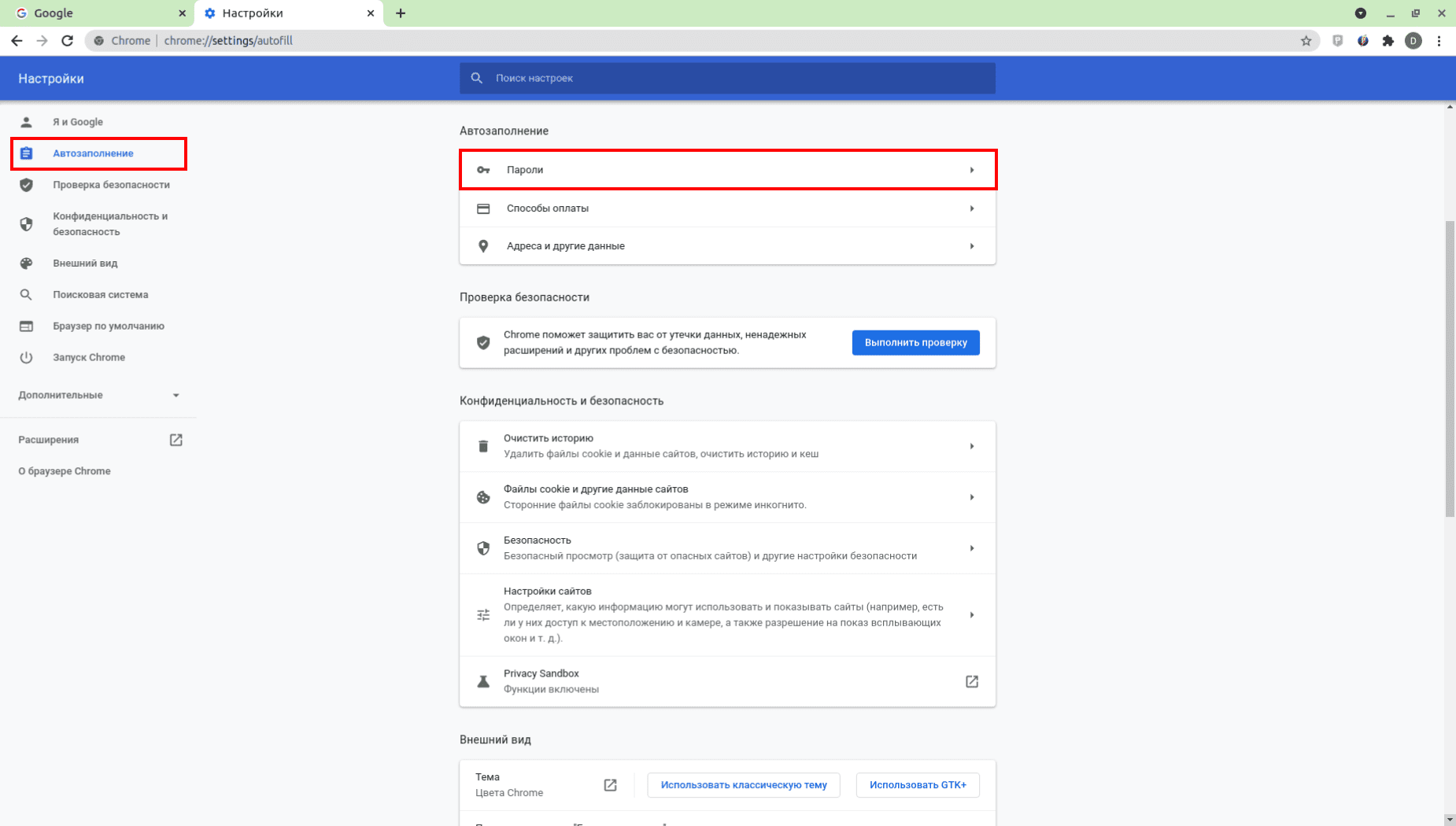 2. Перейдите на вкладку Автозаполнение и нажмите Пароли.