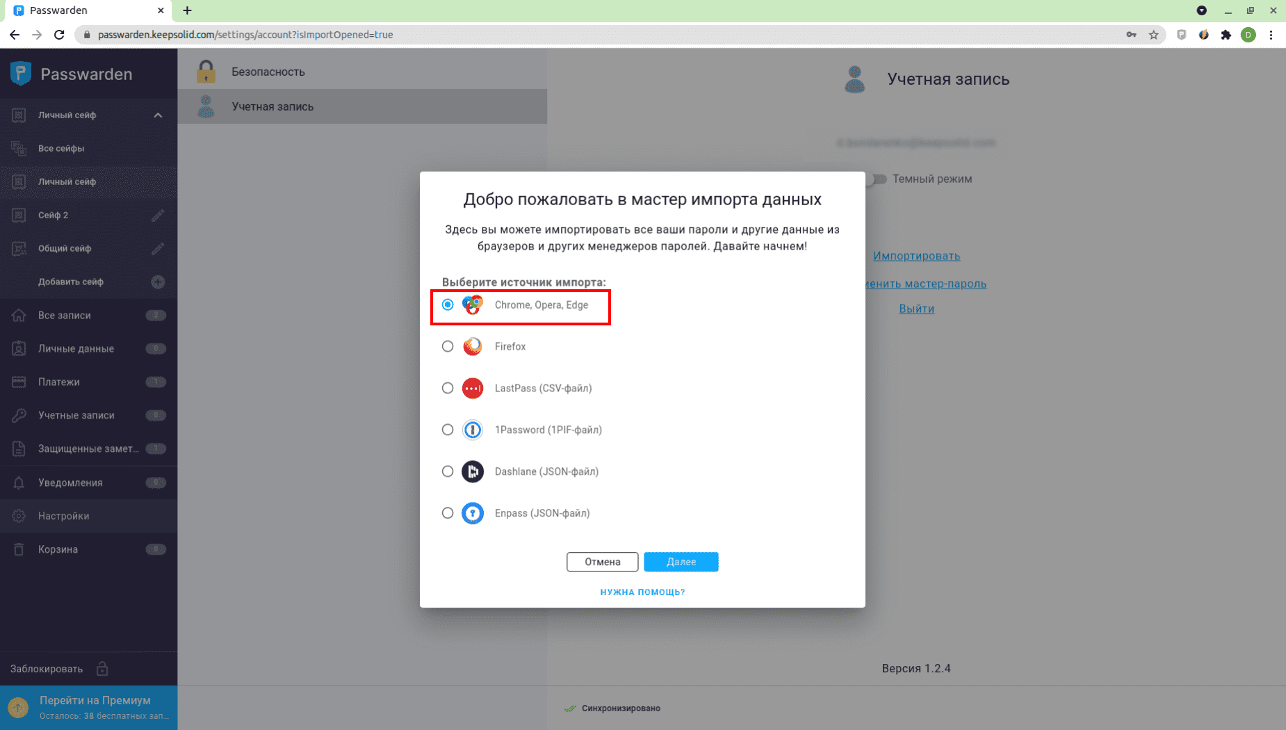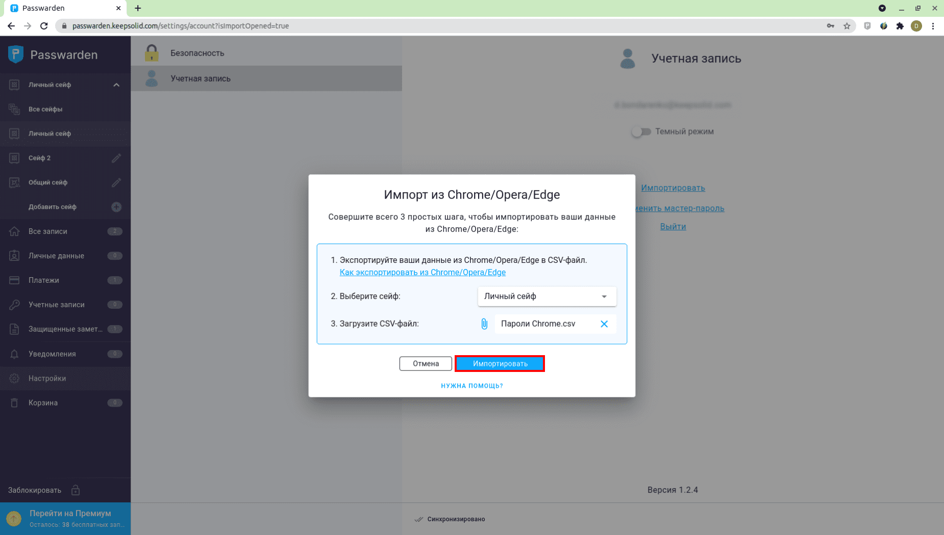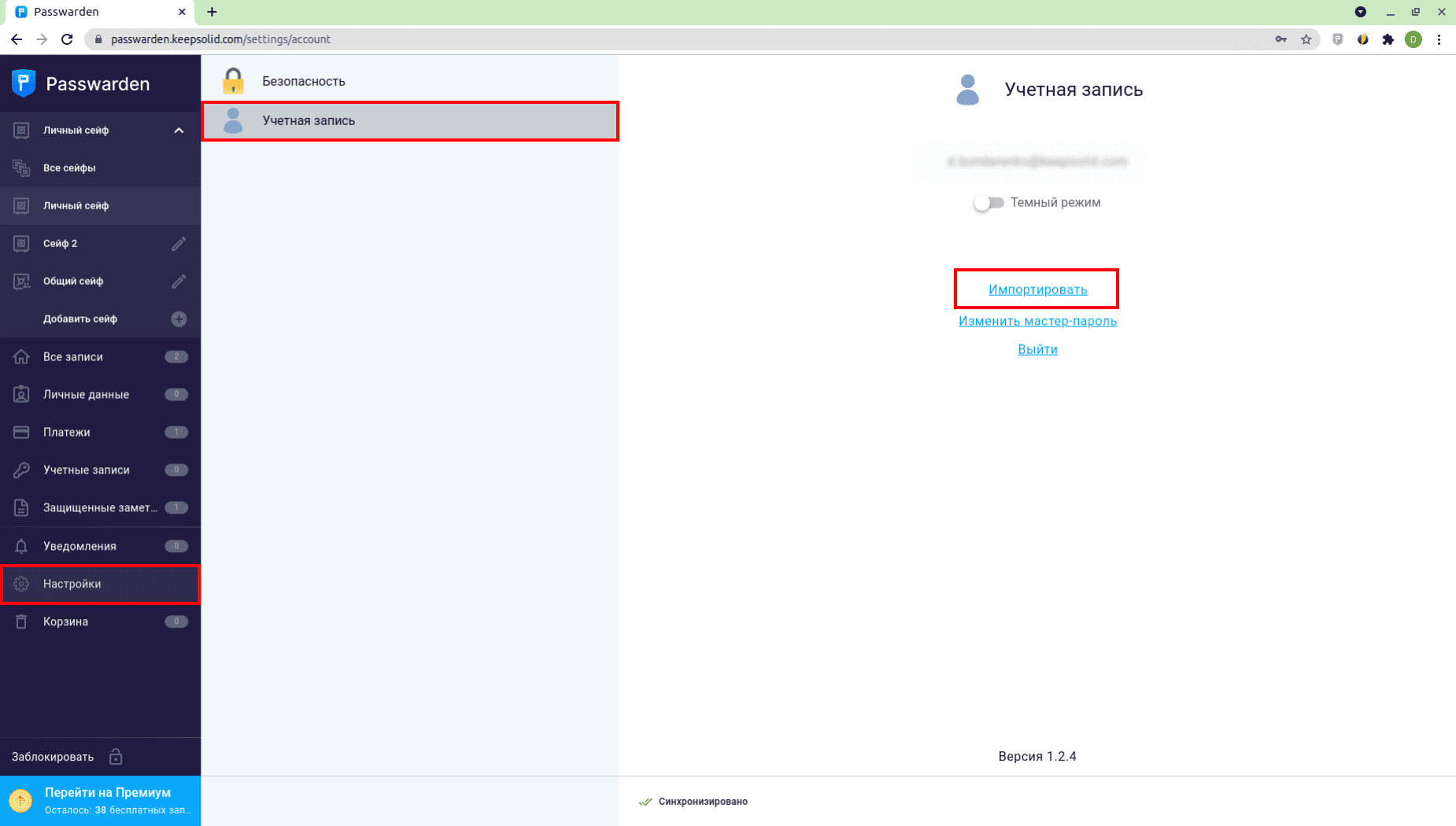 1. Откройте наш безопасный менеджер паролей и перейдите в Настройки > Учетная запись > Импортировать.