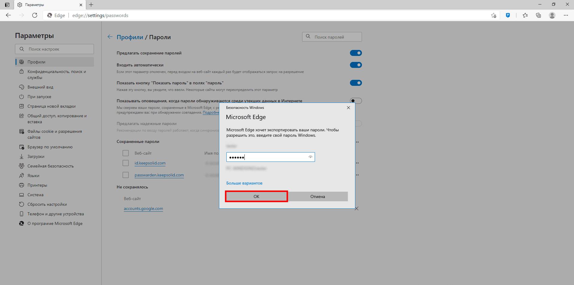 5. Для экспорта данных введите свой пароль компьютера и нажмите OK.