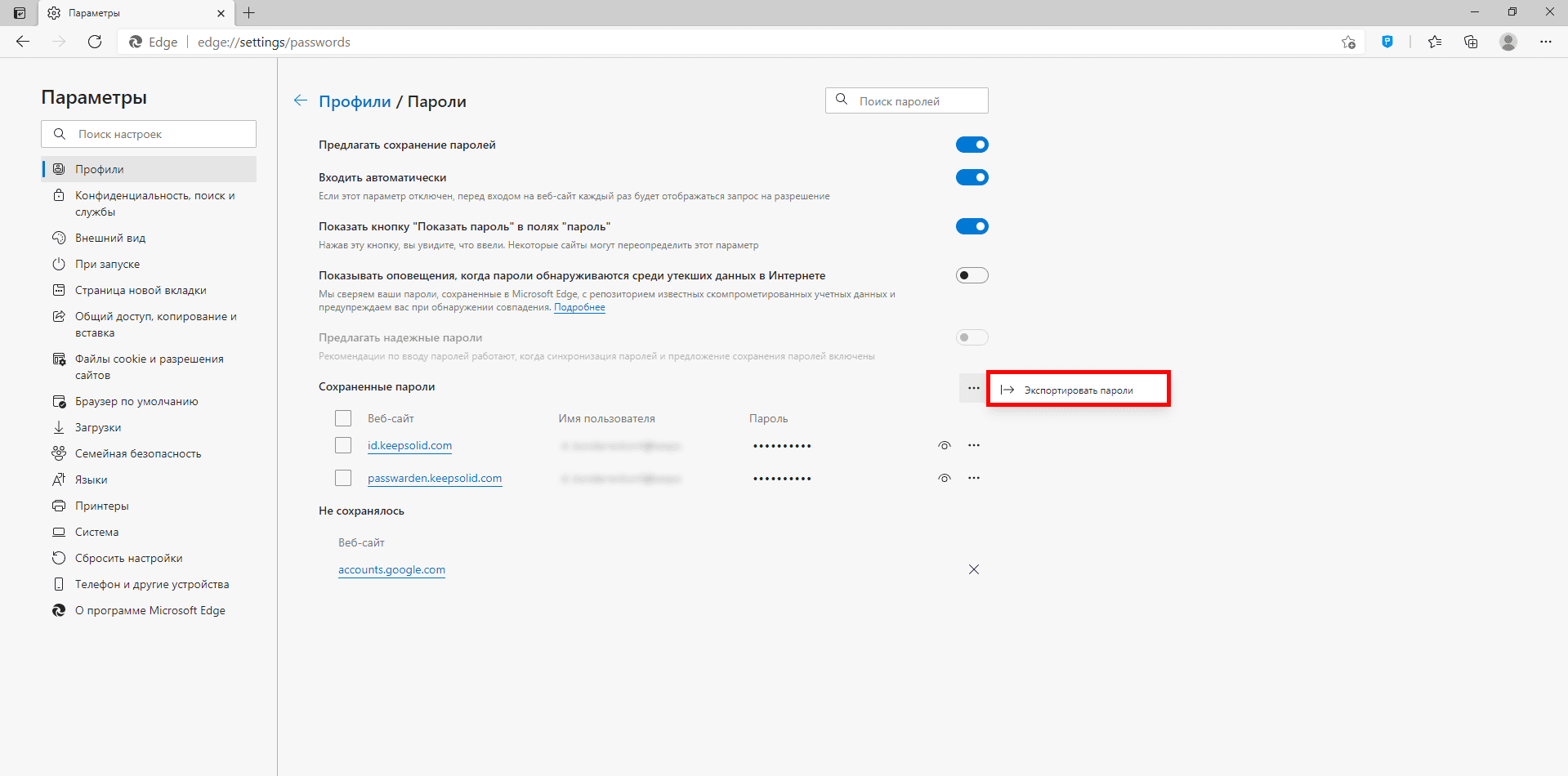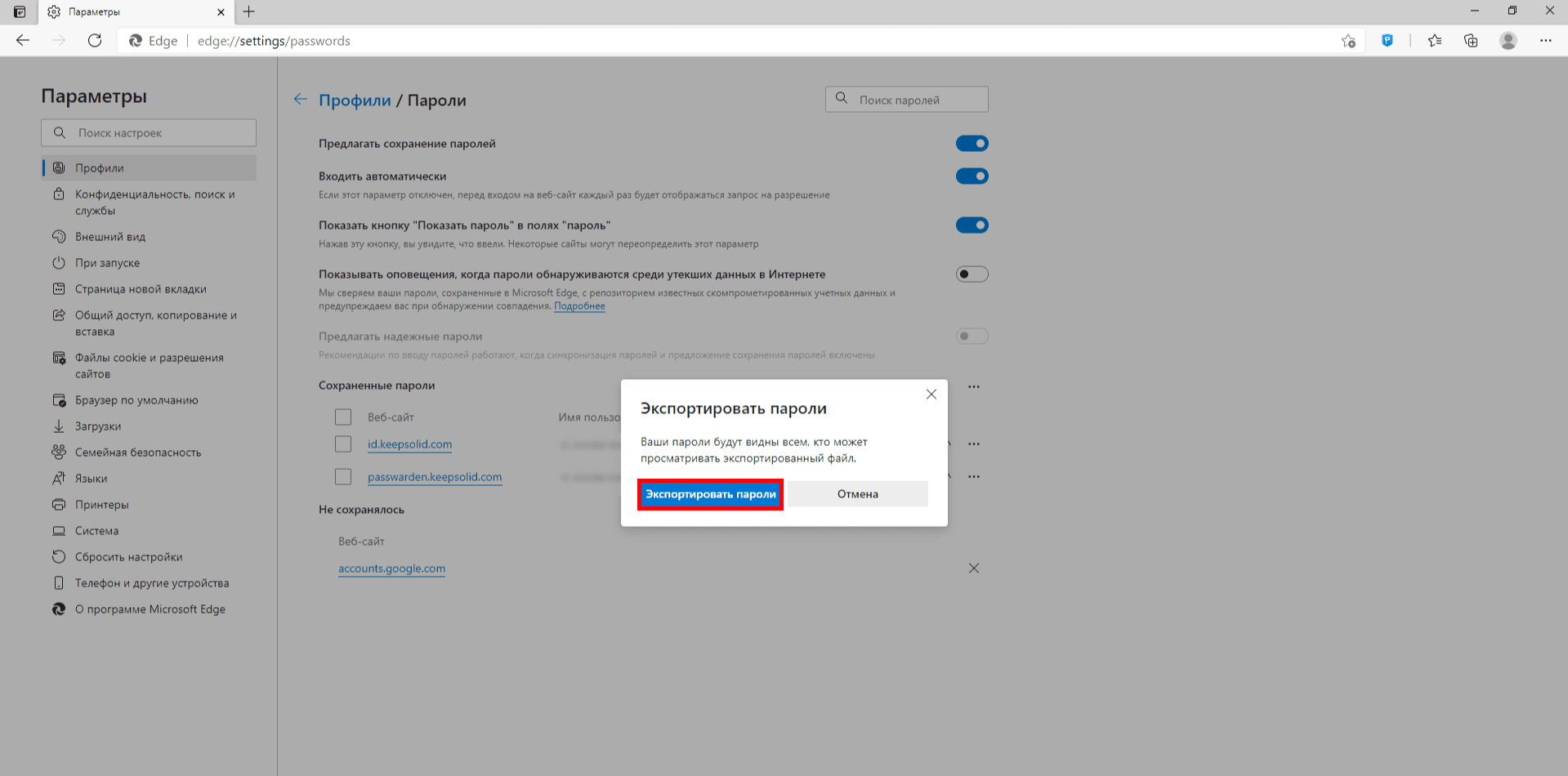 4. Нажмите Экспортировать пароли.