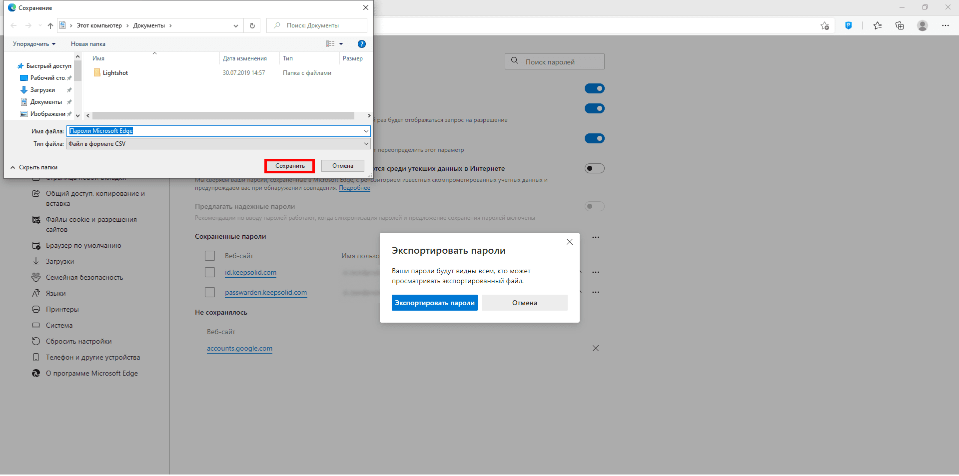 6. Выберите папку, в которой вы хотите сохранить пароли Edge и нажмите Сохранить.