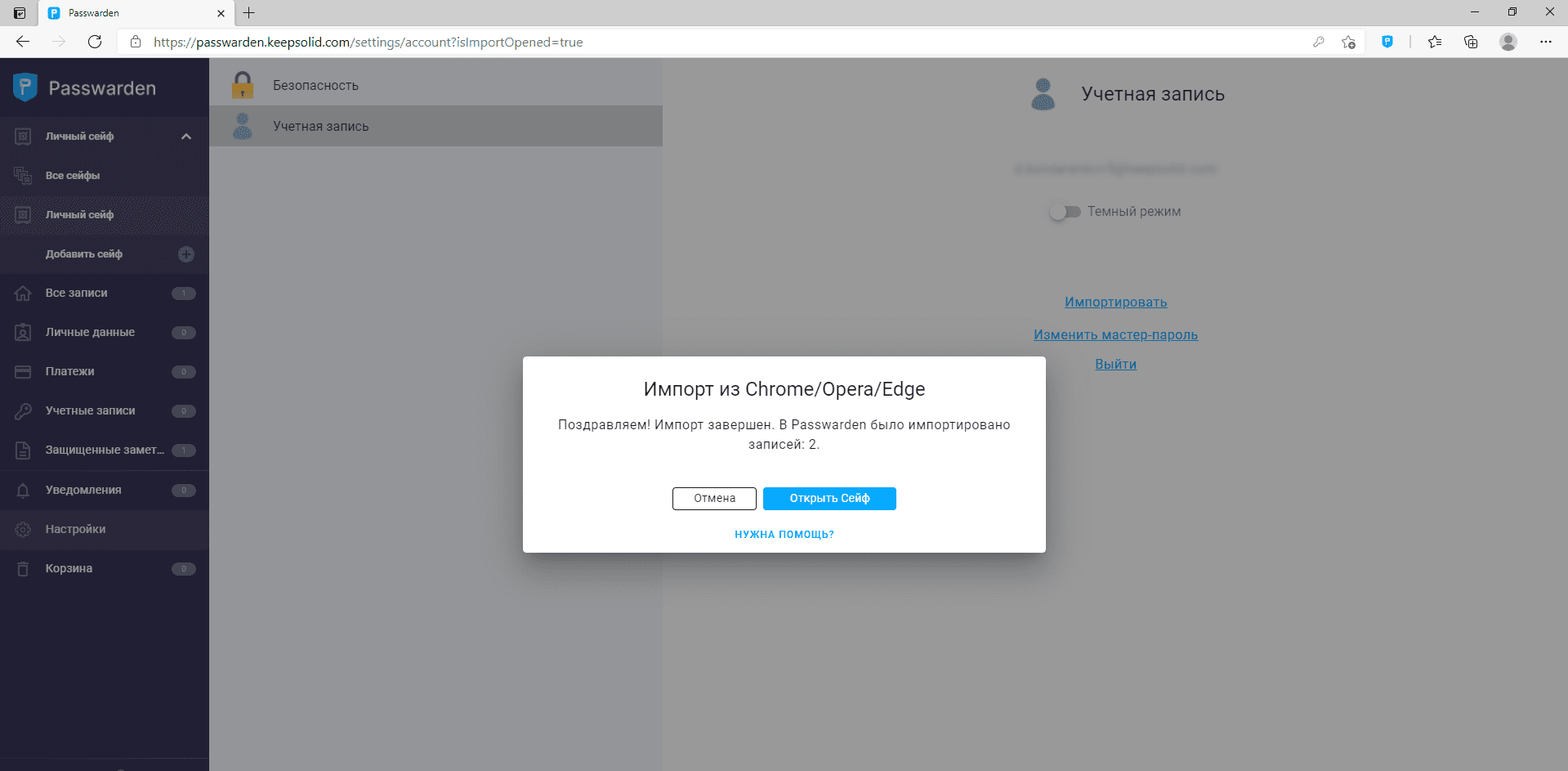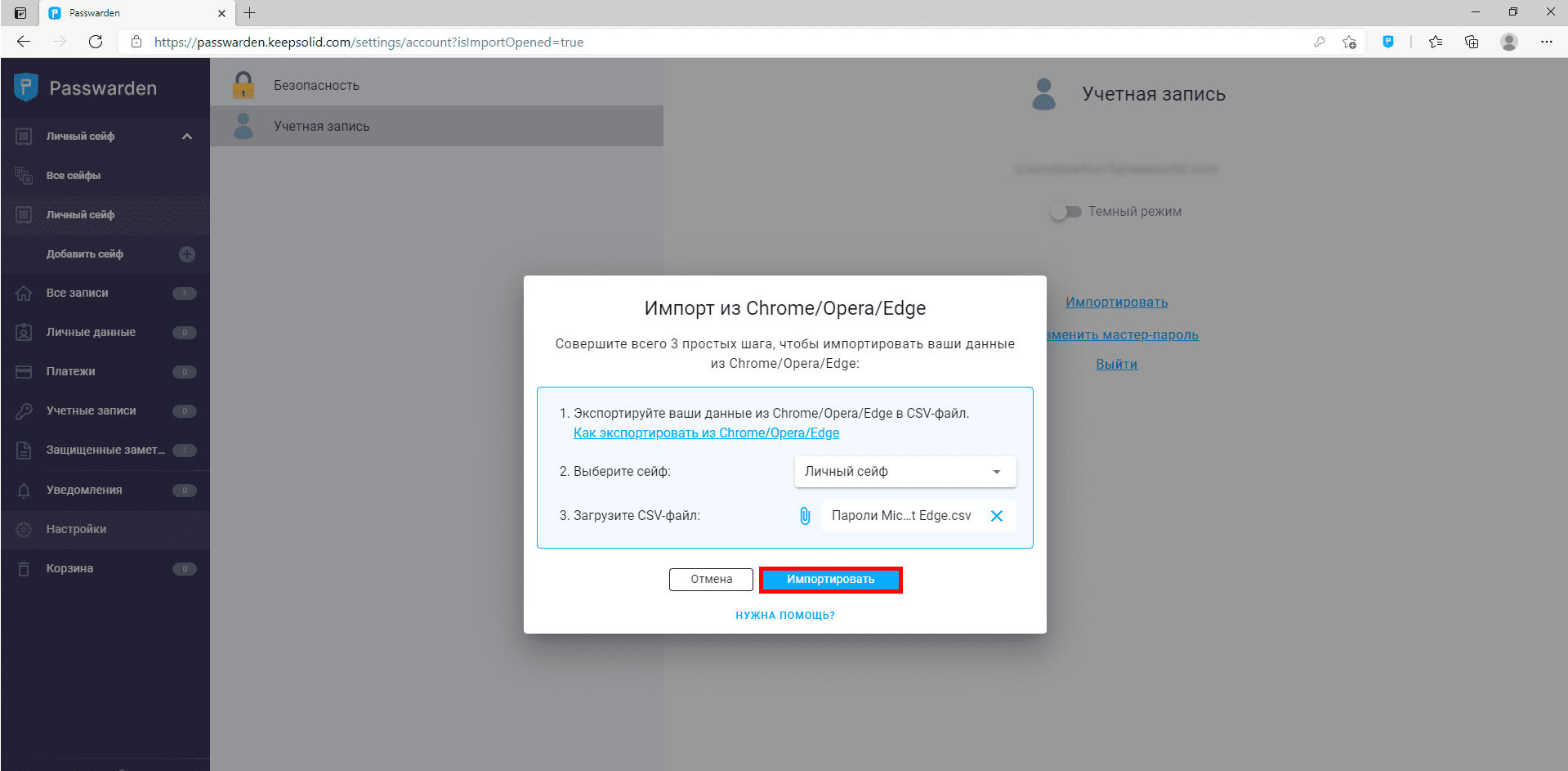 3. Выберите сейф, в котором вы хотите хранить эти пароли и загрузите соответствующий файл. Нажмите Импортировать.