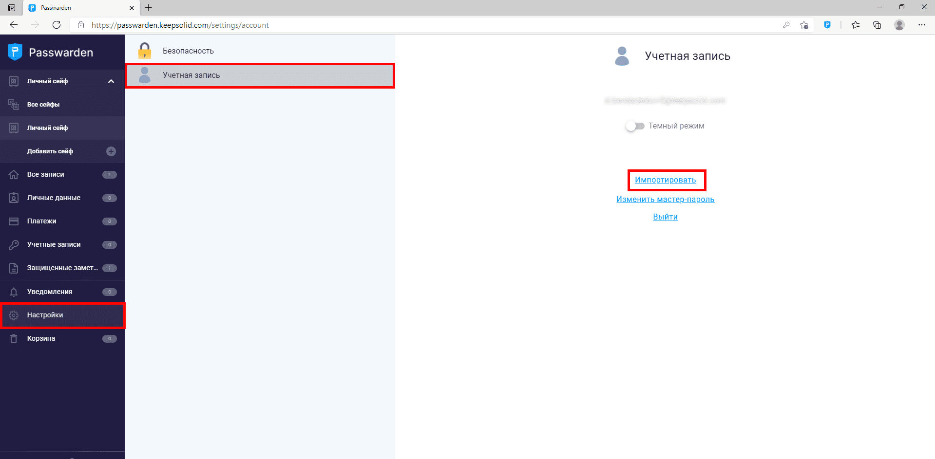 1. Откройте приложение Passwarden и перейдите в меню Настройки > Учетная запись > Импортировать.