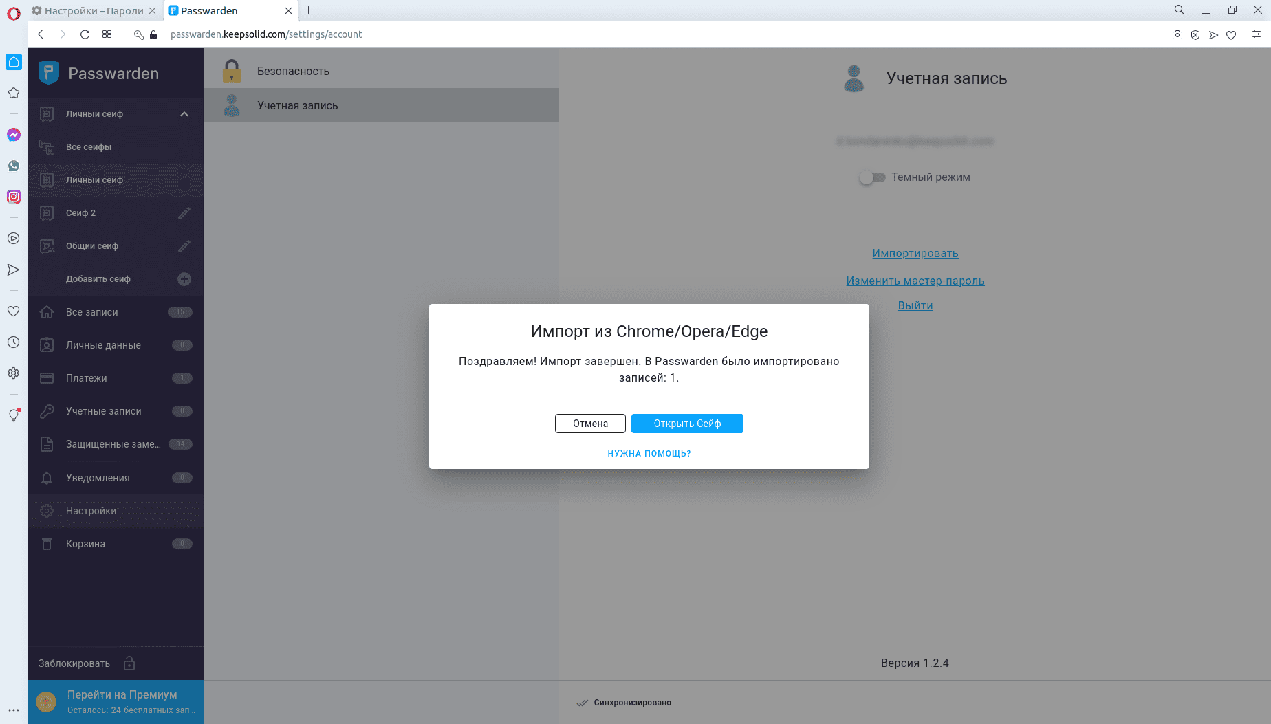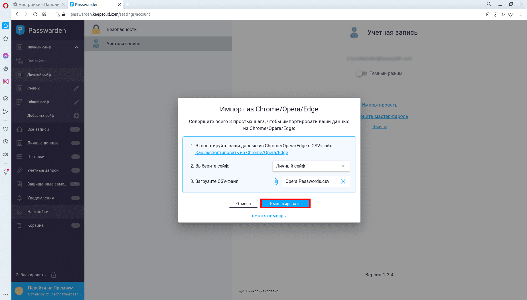 3. Выберите Сейф, в котором вы хотите хранить все ваши пароли и выберите файл в формате .csv, который вы экспортировали из Opera. Нажмите Импортировать.