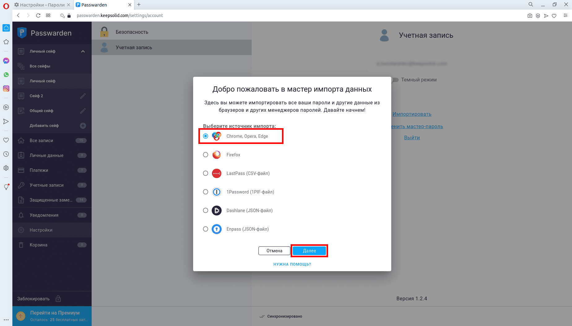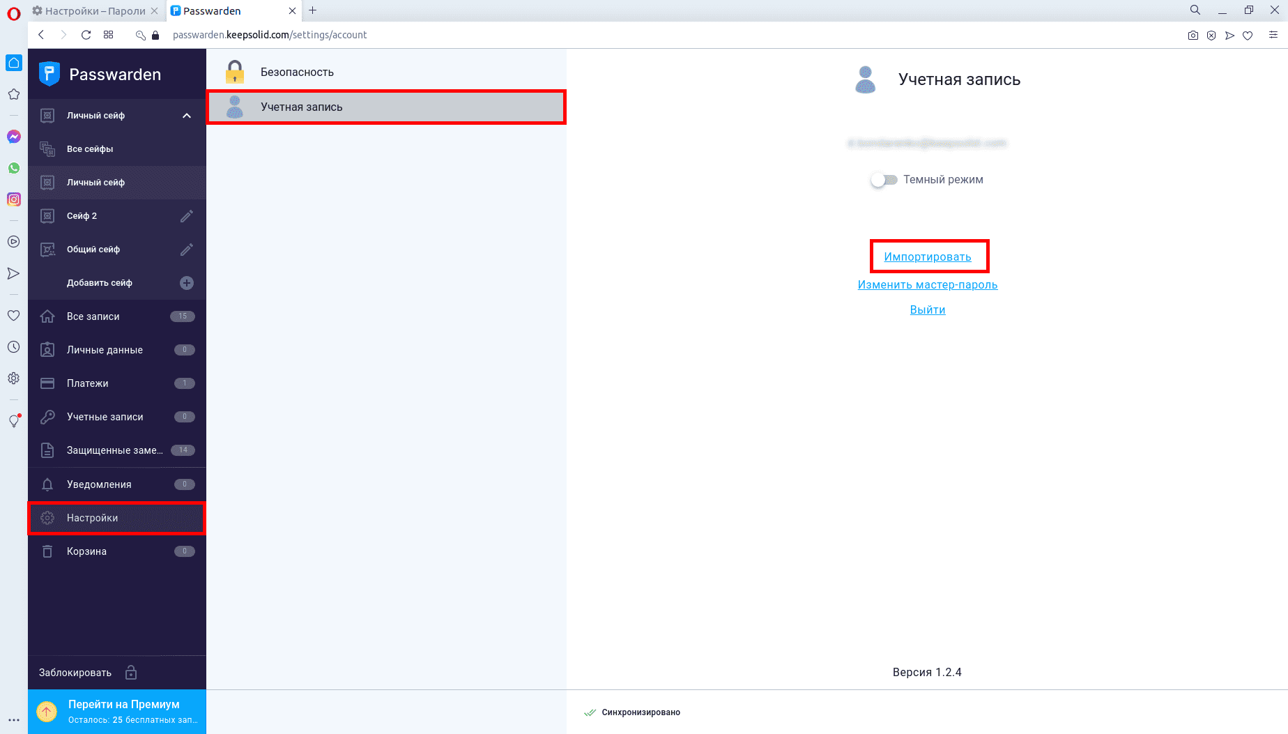 1. Откройте приложение Passwarden. Перейдите в Настройки > Учетная запись > Импортировать.