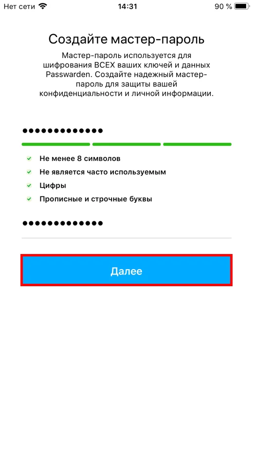 2. Следующим шагом является создание мастер-пароля. Установите, подтвердите его и нажмите Далее.