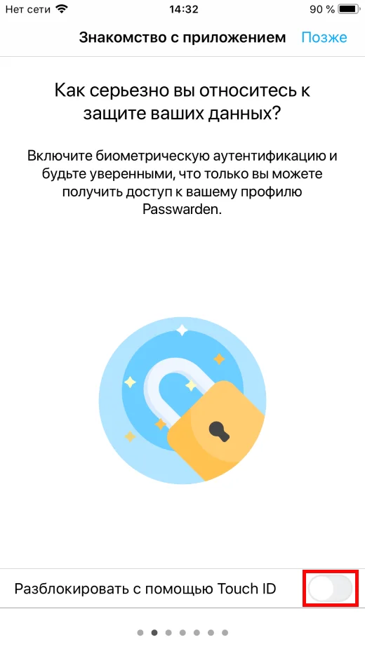 4. Если ваш iPhone или iPad поддерживает функцию биометрической разблокировки, вы можете входить в Passwarden, используя свой отпечаток пальца, а не мастер-пароль. Чтобы активировать функцию Touch ID, нажмите кнопку-переключатель рядом с Разблокировать с помощью Touch ID.