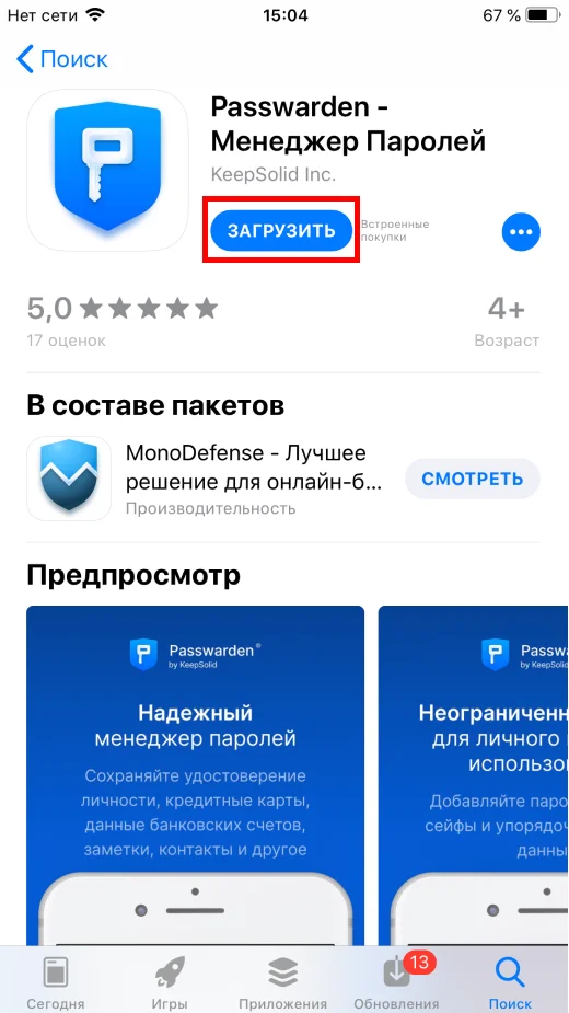 2. Выберите приложение Passwarden и нажмите кнопку Загрузить.
