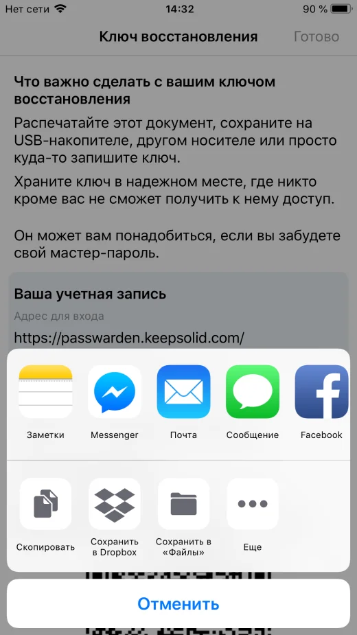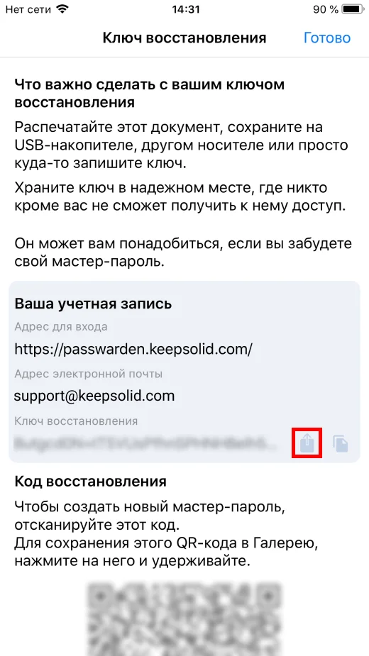 Нажмите на иконку Сохранить и держите ключ в надежном месте. После сохранения ключа восстановления нажмите Готово.