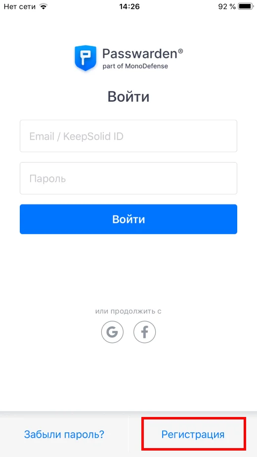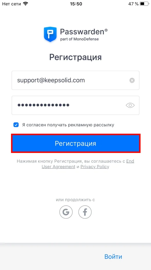 Чтобы создать новый new KeepSolid ID, нажмите Регистрация. Введите ваш email, пароль, и отметьте пункт Я согласен получать рекламную рассылку. Затем нажмите кнопку Регистрация.