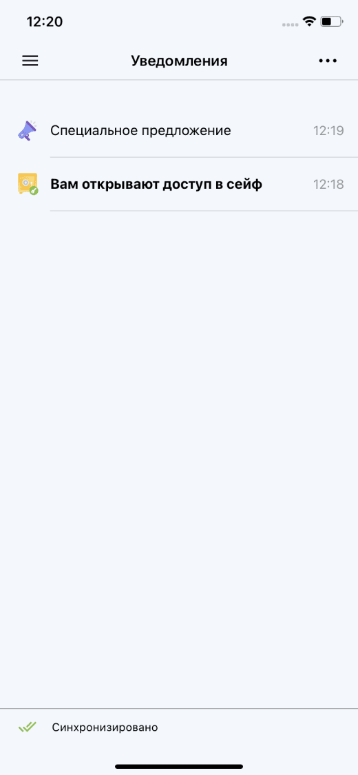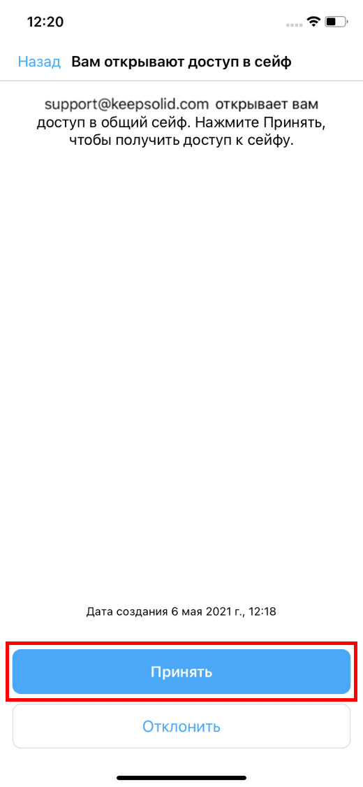 5. Войдите в приложение с вашим KeepSolid ID и перейдите во вкладку Уведомления. Там появится сообщение Вам открывают доступ в сейф...