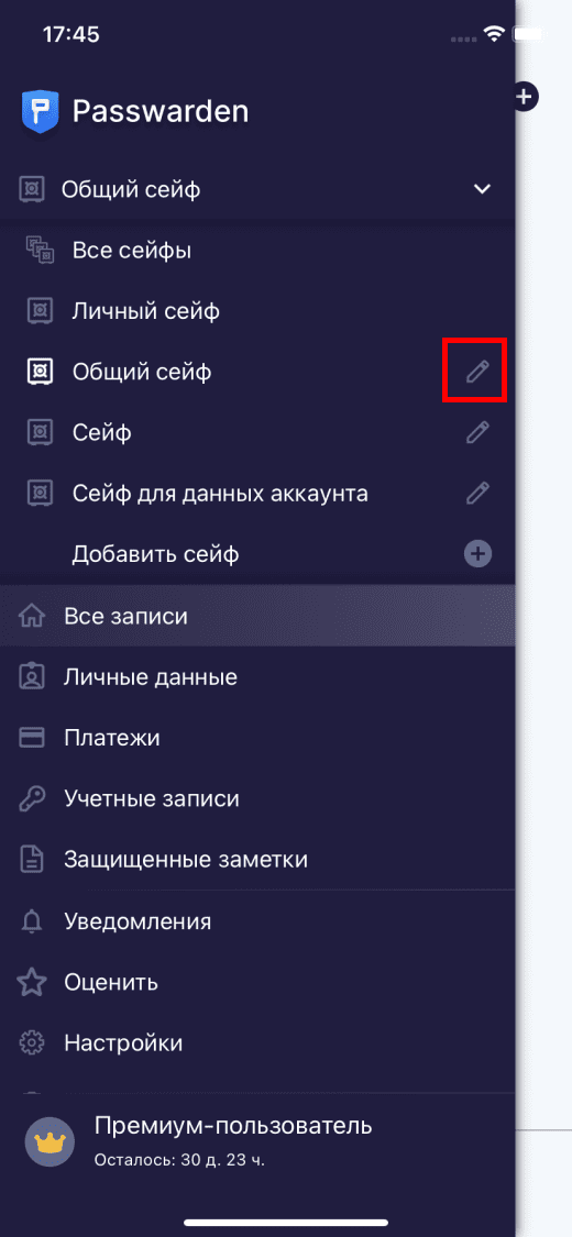 1. Откройте настройки общего сейфа и нажмите кнопку