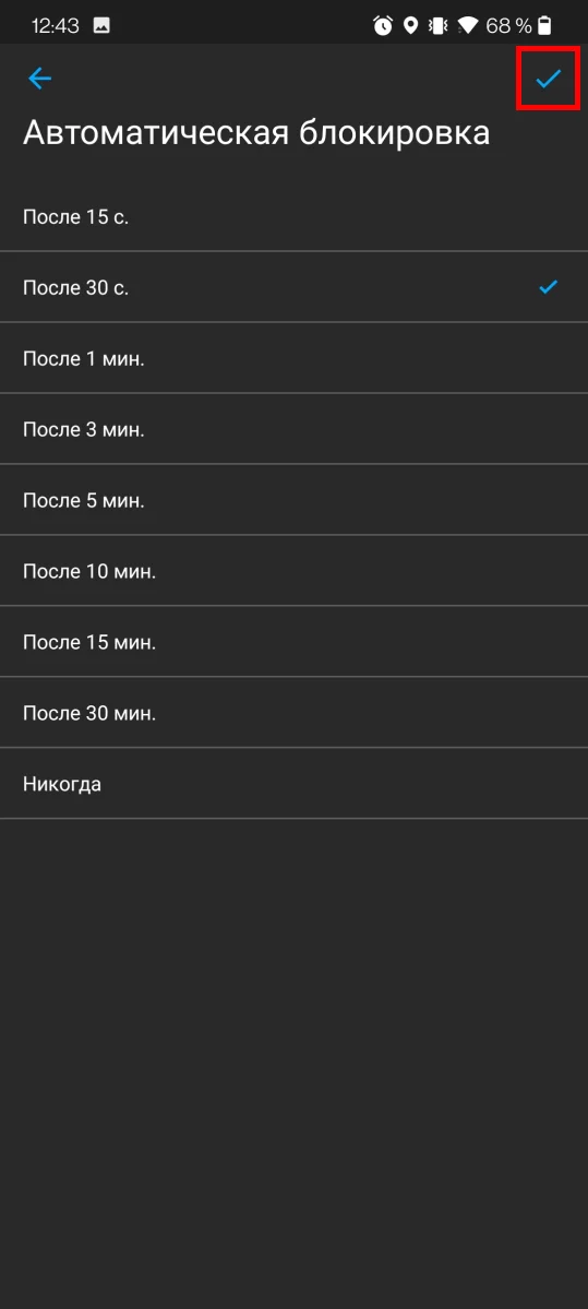 2. Выберите подходящее время блокировки и нажмите Сохранить в правом верхнем углу.