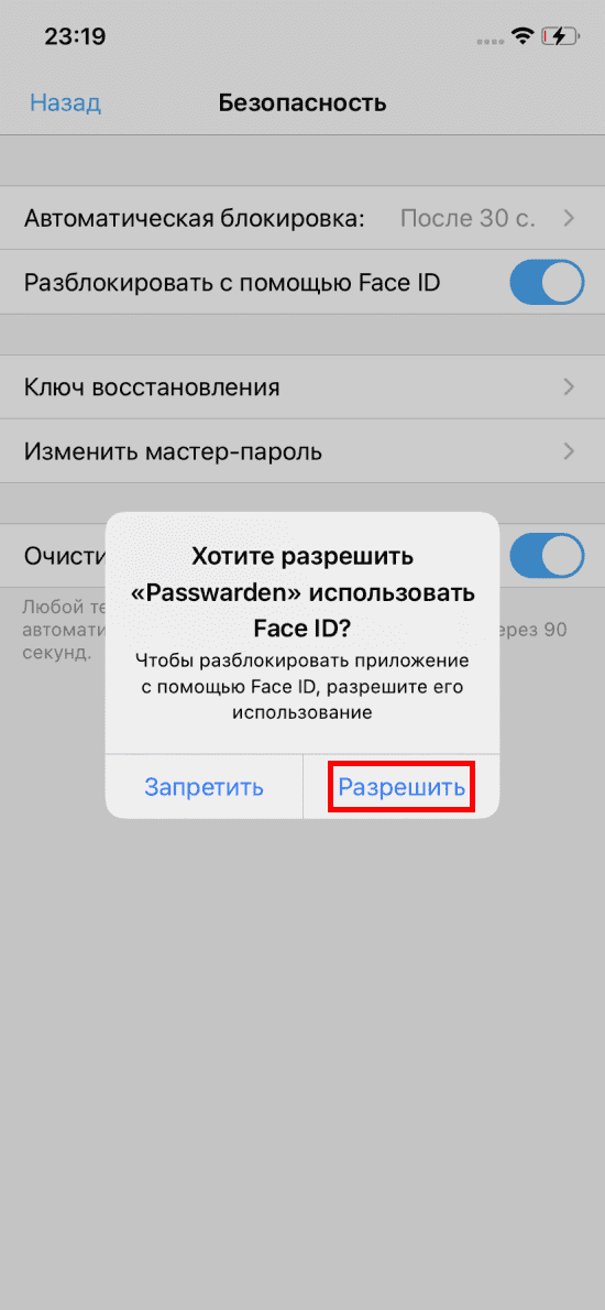 3. Нажмите Разрешить, чтобы разрешить использование Face ID в приложении Passwarden.