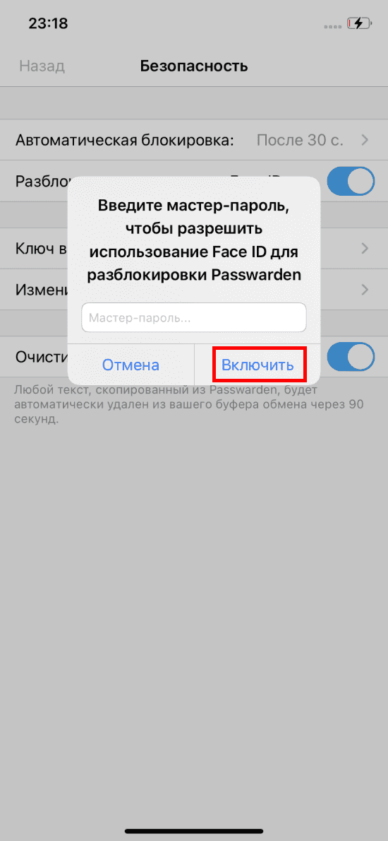 2. Подтвердите мастер-пароль и нажмите Включить.