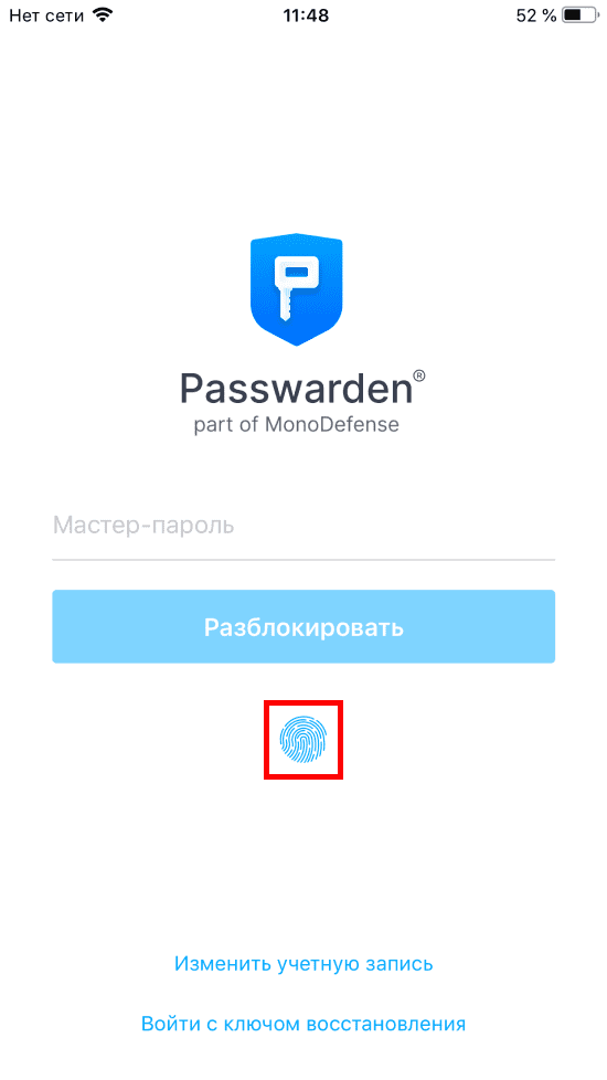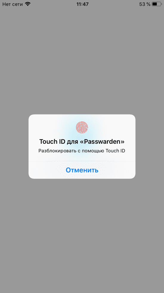 После включения разблокировки с помощью биометрических данных, вы увидите запрос о входе в учетную запись Passwarden с помощью Touch ID.