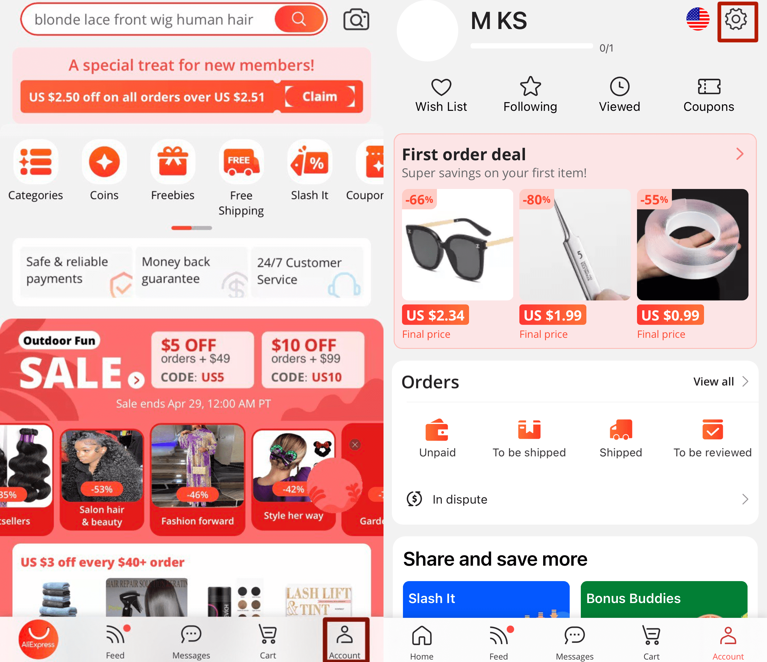 1. Open your AliExpress app on your phone. You will see the account icon in the bottom right of your screen.