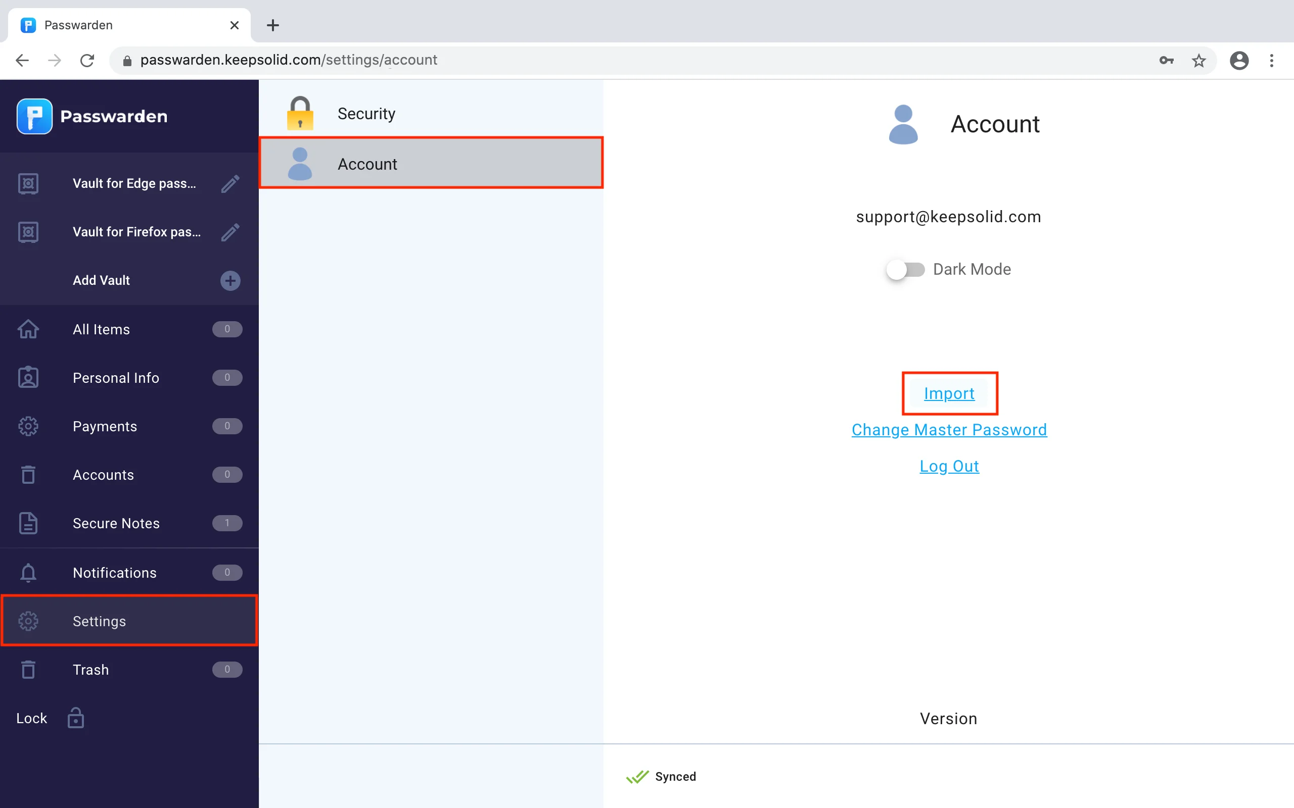 1. Open our secure password manager and go to the Settings > Account > Import.