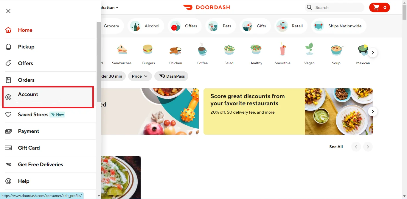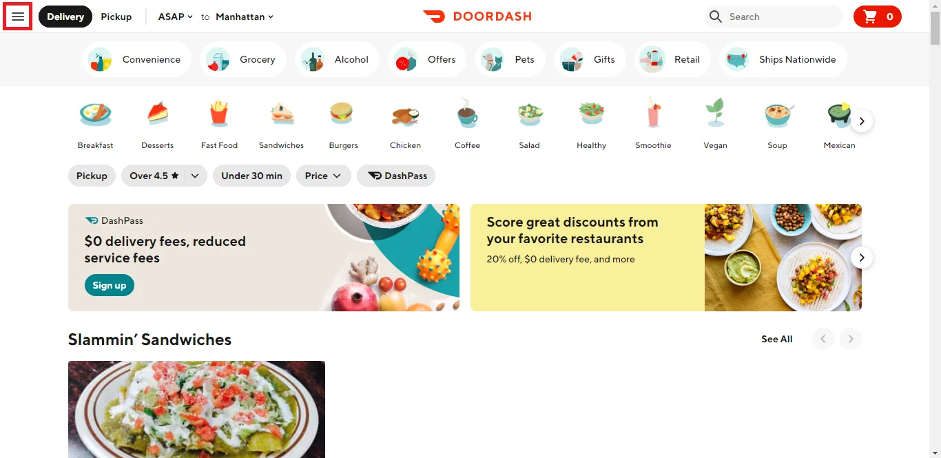 1. На головній сторінці облікового запису DoorDash натисніть значок гамбургера.