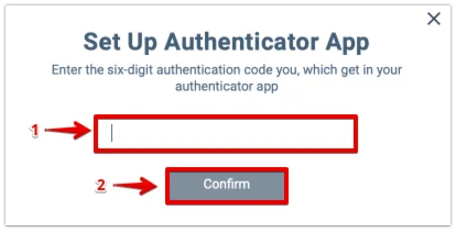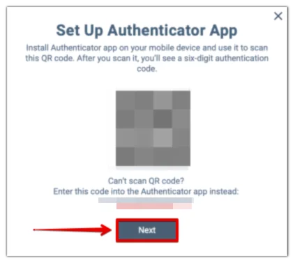 6. Click Next on the QR code screen, enter the authentication code you see in your Authenticator app and click Confirm.
