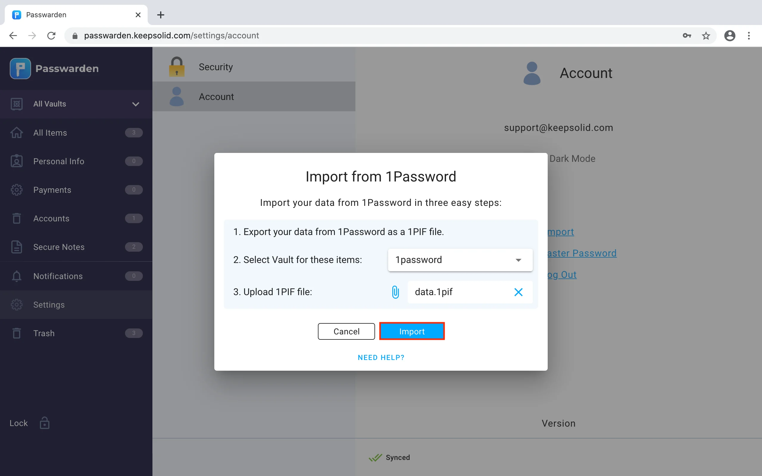 3. Select the Vault you want to import your data to and upload the exported file. Press Import.