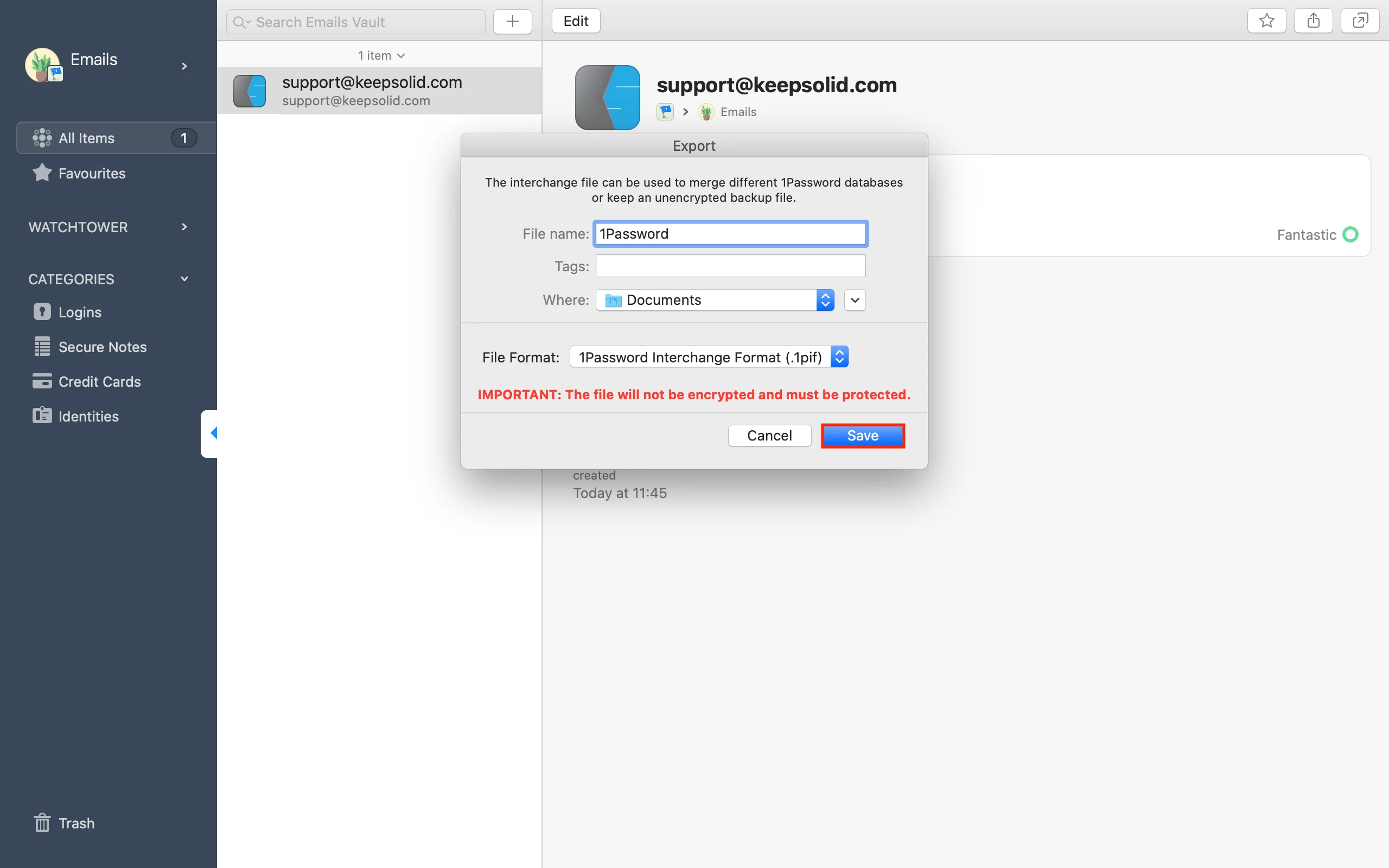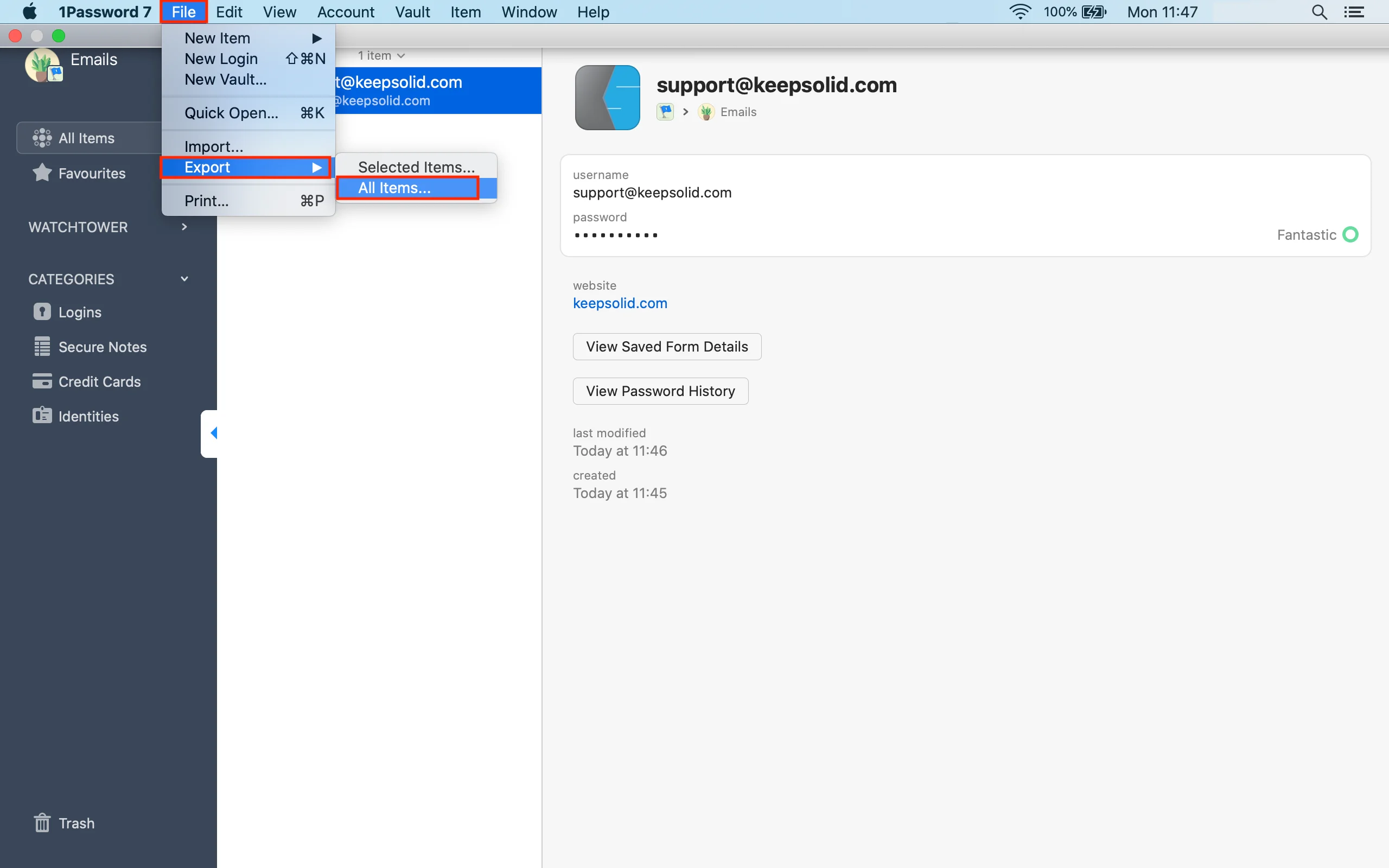 1. Open 1Password on your macOS or Windows device and go to the All items tab. Press File > Export… > Export all items.