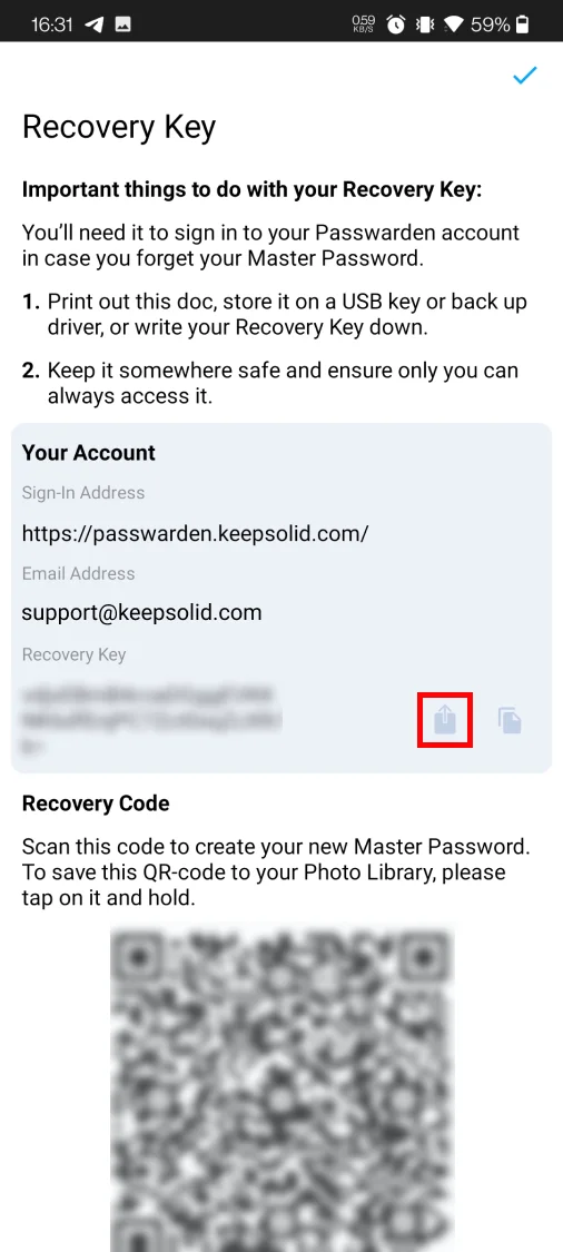 Примітка: у випадку, якщо ви забули ваш майстер-пароль, вам знадобиться ваш ключ відновлення, щоб увійти в обліковий запис Passwarden. Переконайтеся, що ви зберегли його.