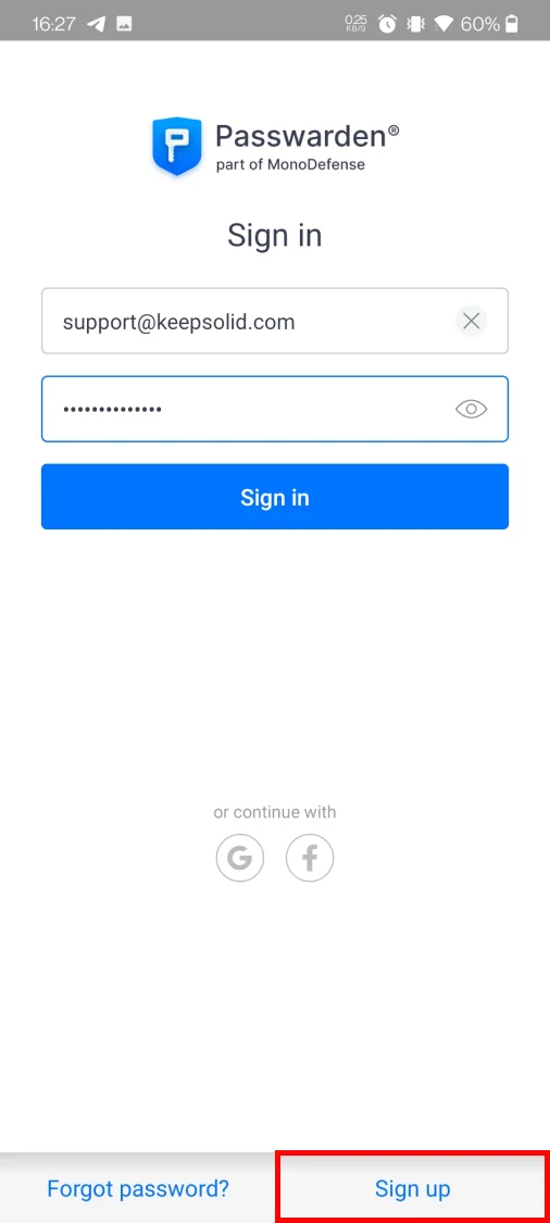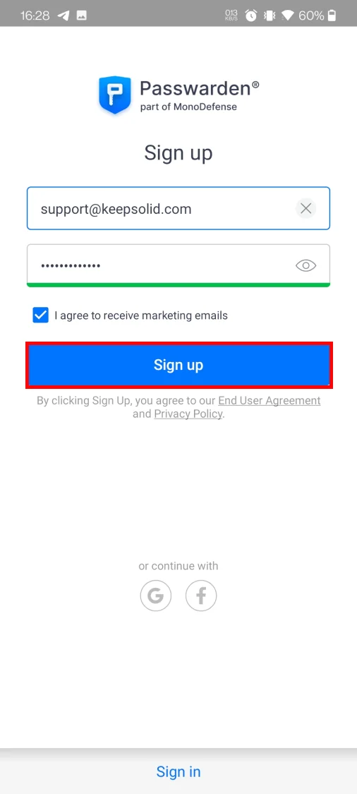 Щоб створити новий KeepSolid ID натисніть Sign up(Реєстрація), введіть ваш email і пароль, позначте пункт I agree to receive marketing emails(Я згоден на отримання новин і рекламної розсилки), і натисніть кнопку Sign up(Зареєструватися).