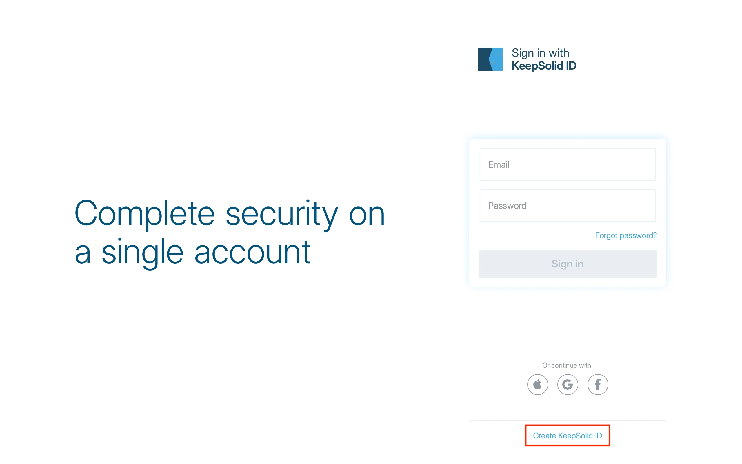 1. Відкрийте Passwarden і увійдіть за допомогою вашого KeepSolid ID. Ви також можете увійти за допомогою Apple ID, Facebook або Google.
