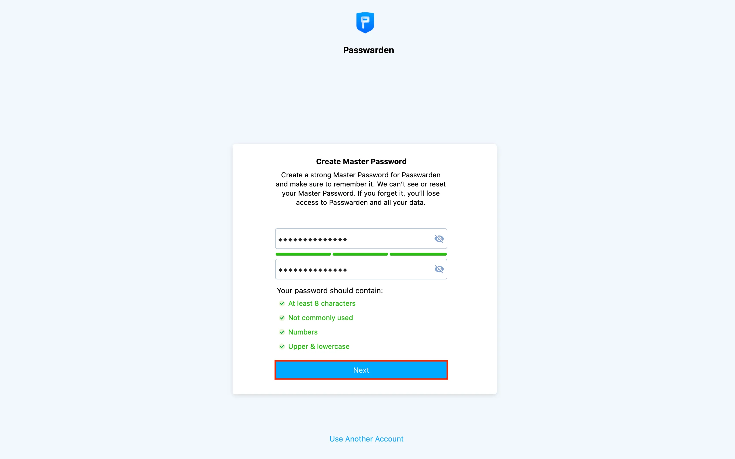 2. Наступним кроком є створення майстер-паролю – пароля від вашого облікового запису Passwarden. Підтвердьте його та натисніть кнопку Next(Далі).