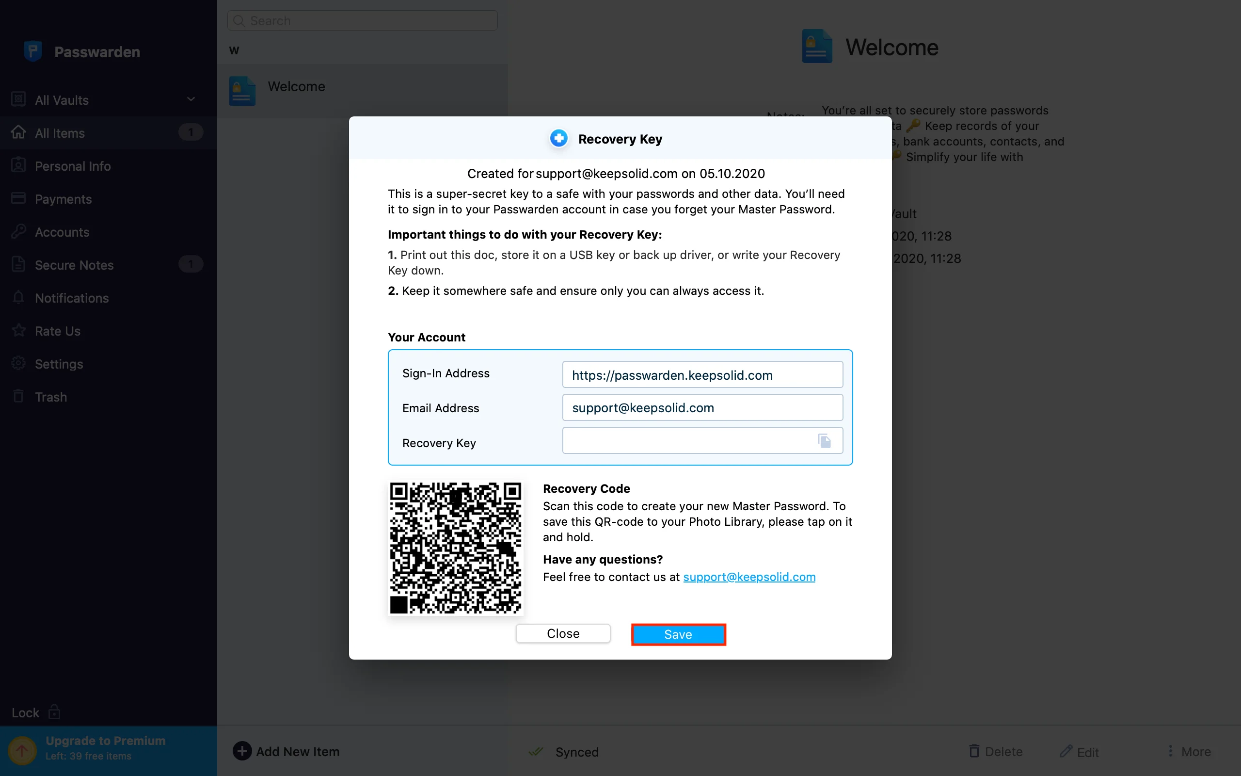3. Ось ваш Ключ відновлення. Натисніть Save(Зберегти) та оберіть, куди ви хочете зберегти цей ключ. Потім натисніть кнопку Close(Закрити).
