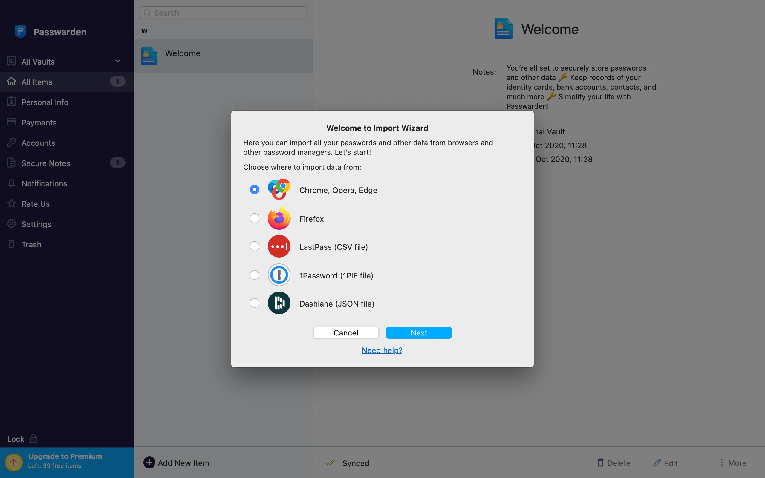 4. Чудово! Далі відкриється майстер імпорту даних. З ним ви можете легко перенести свої дані з браузерів або інших менеджерів паролів Passwarden. Для цього ознайомтеся з нашою інструкцією.