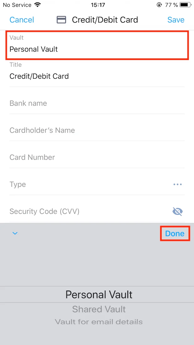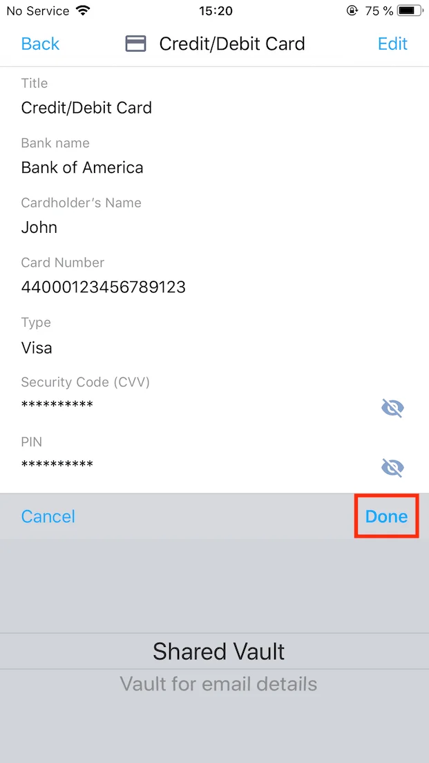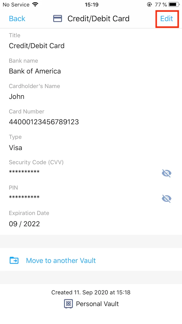 2. Якщо ви бажаєте перемістити цей запис в інший сейф, натисніть кнопку Move to another Vault(Перемістити в інший сейф) та оберіть новий сейф для цього запису. Натисніть кнопку Done(Готово).