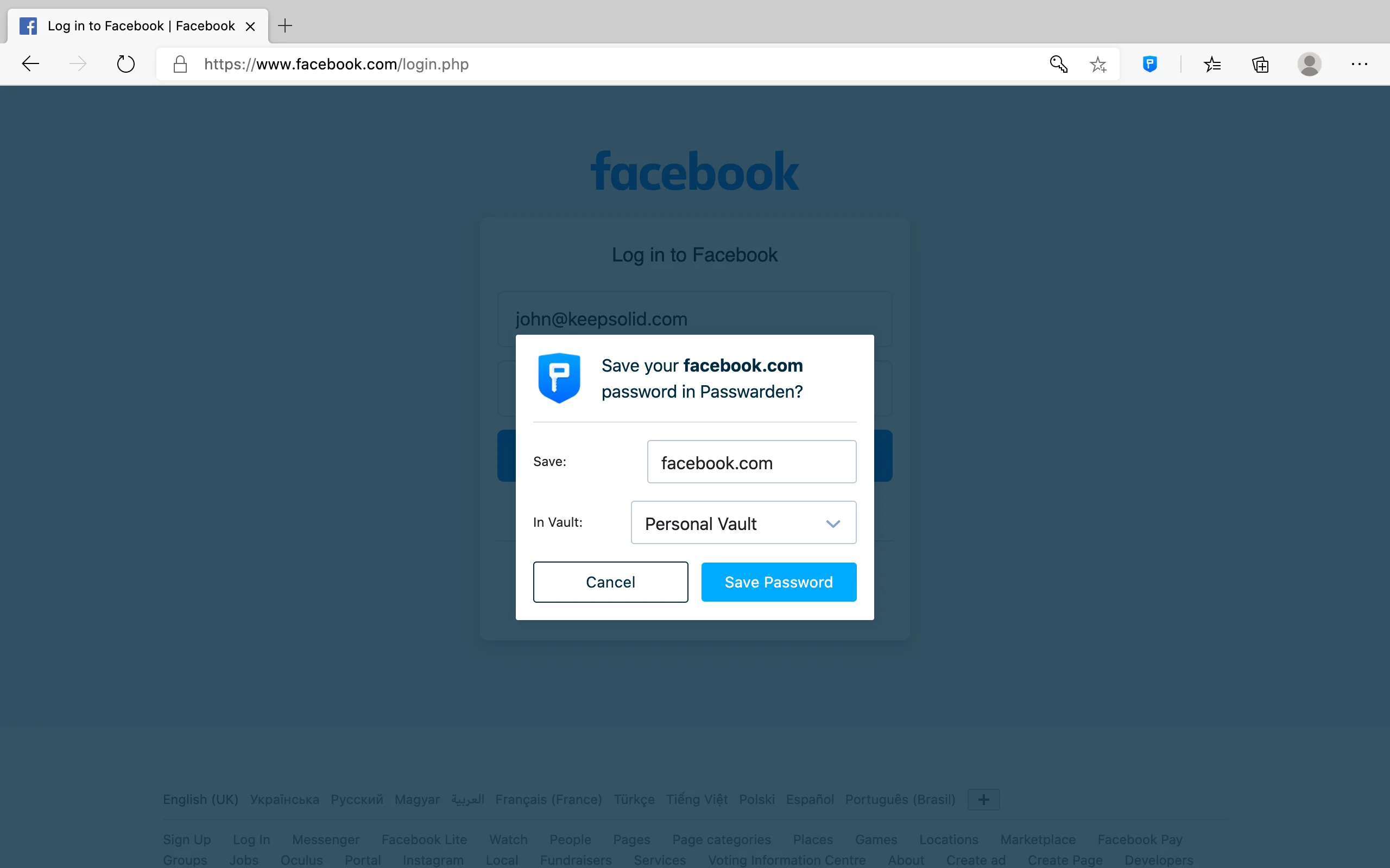 2.2. Якщо введені облікові дані не зберігаються у вашому профілі Passwarden, вам буде запропоновано зберегти їх як новий запис.