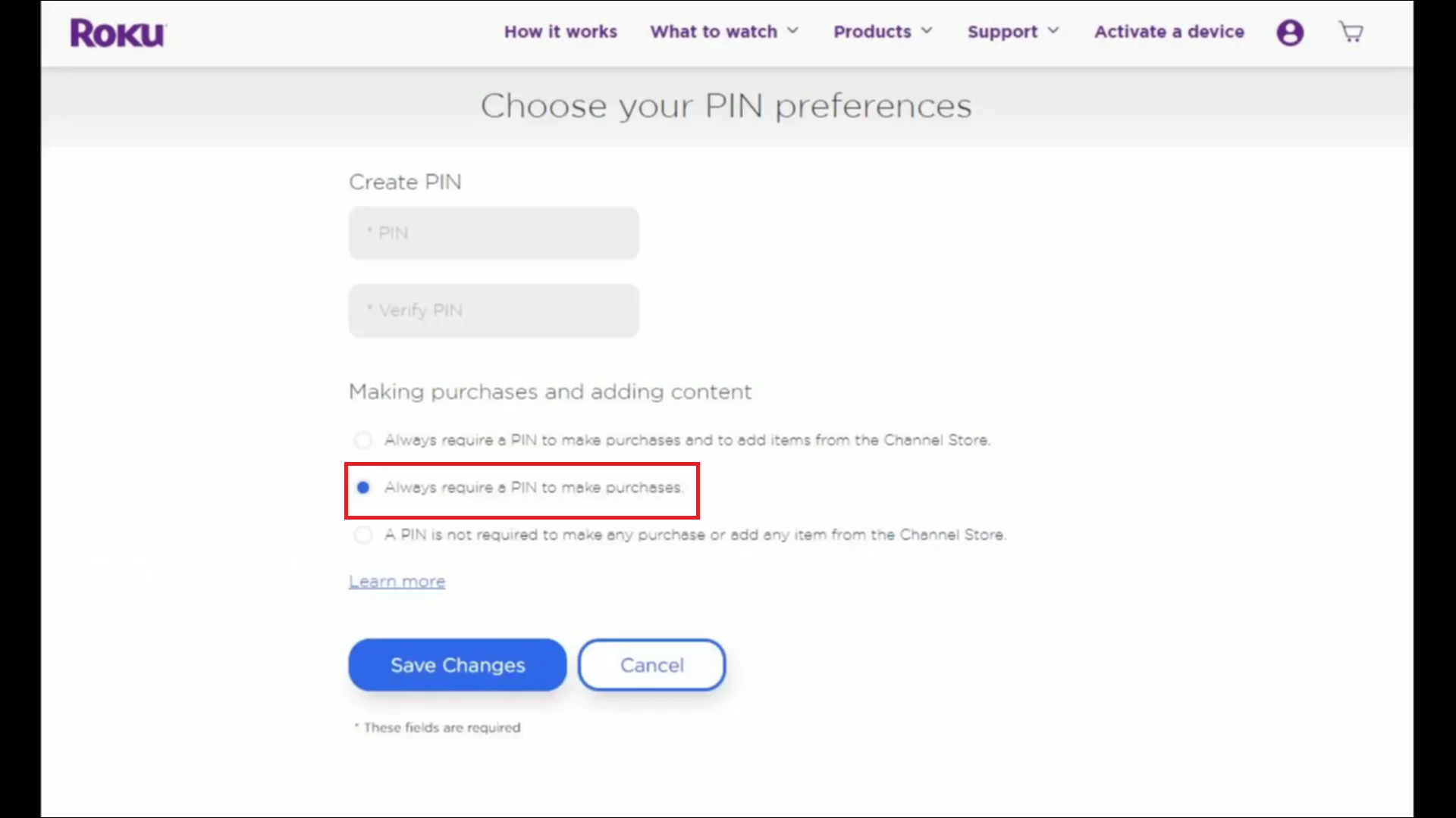 You'll be sent back to your Roku My Account screen, where a message will display across the top of the screen notifying you that your PIN preference has been updated.